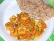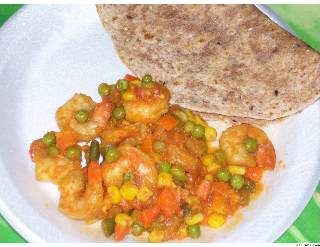 Make a light masala with 1tsp oil, ginger/garlic paste, tomato puree, onions, salt, red peper, corriander powder, and haldi. Run the vegis and shrimps under water. Add them to the masala, simmer for 10 mins on medium heat. For roti, use whole wheat tortilas.