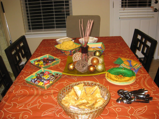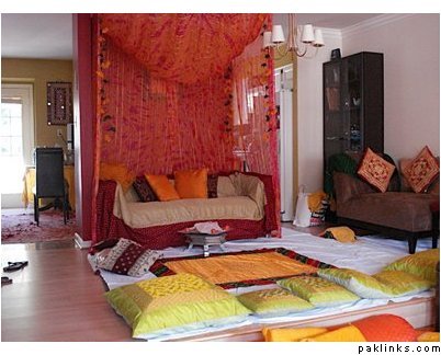 At the surprise dholki for my cousin I did in October, we had lots of yellow, orange, green, and red decorations. She thought it was an Eid party, so she was dressed up. I made a stage area with lots of orange and pink dupattas. Around the stage were white chaddars for all the girls to sit and sing and gather around the bride. I printed the song packets in bright colors. We had colorful cushions and things to make it festive. We didn’t get a chance to practice any dances for it, but that’s another idea. I added artificial and real flowers to the decor, etc. I also made a platter of desserts and fruits to feed her. And necklaces and bracelets of fresh flowers. Her wedding was in Pak, so I wanted this to be like a mehndi/mayon function for all the people who couldn’t attend.