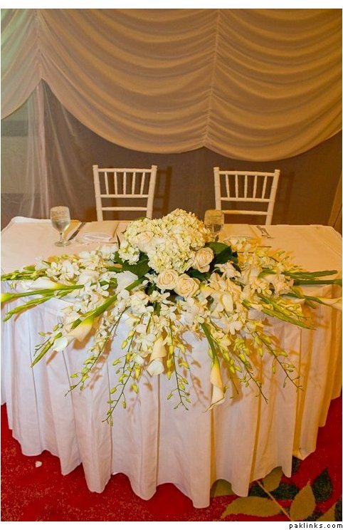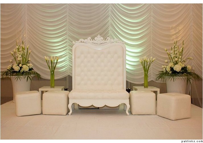 The theme for his fiance’s bridal suit for the Walima is Off White/Emerald Green with an Orange border. So we’re thinking the backdrop should have shades of orange for a contrast? He doesn’t want to have her blend in with the stage. And it’s a June wedding. Any ideas or pics of stages, centerpieces?