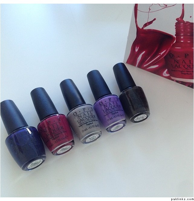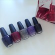 The grey one looks like it MIGHT be "You don't know Jacques" and the purple one MIGHT be "parlez vous OPI".