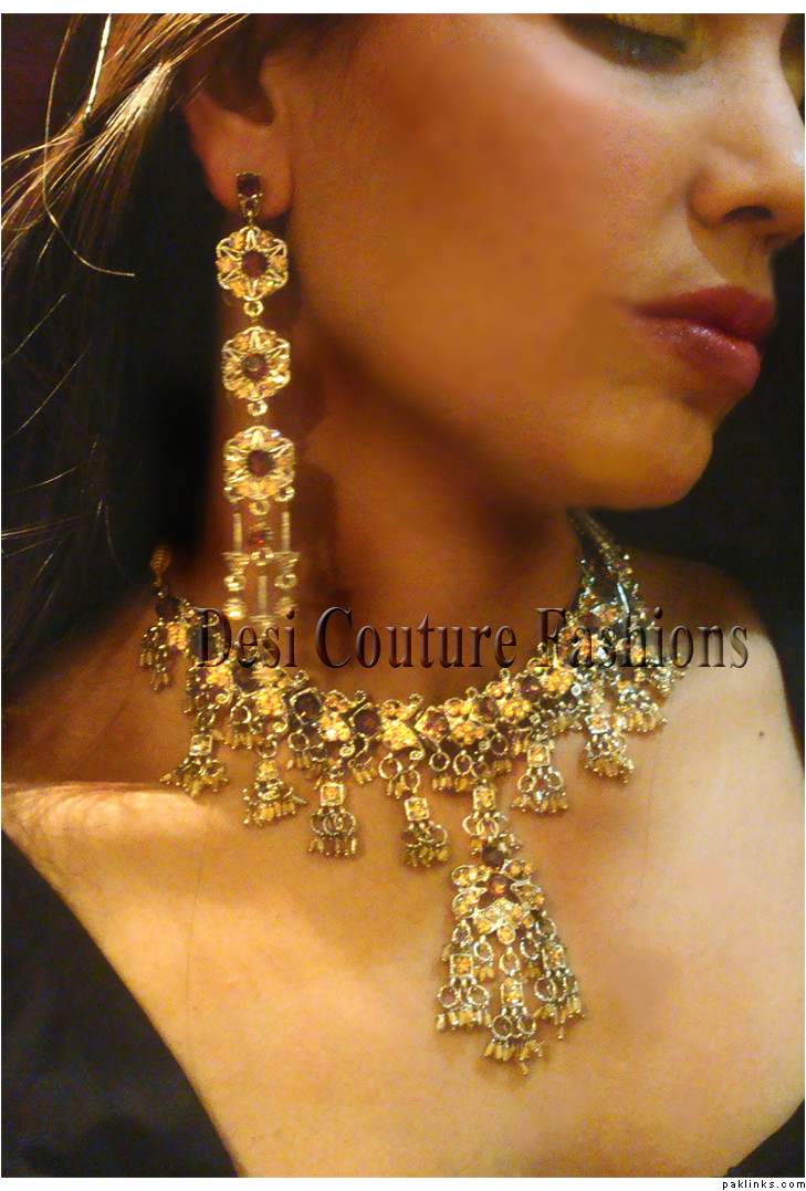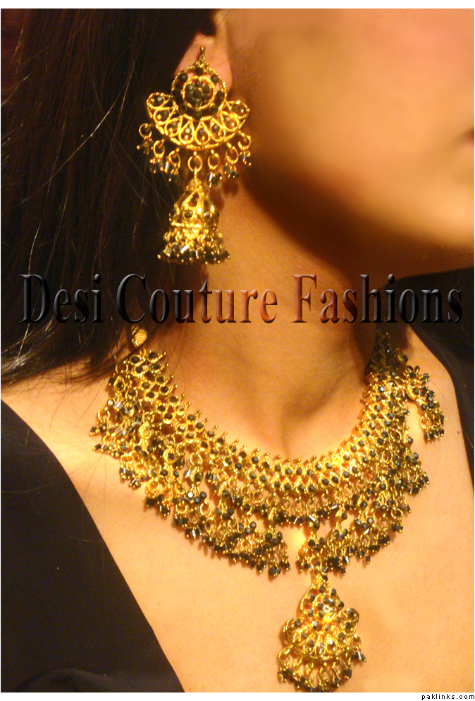 Golden Attire: Stunning heavy gold set with semi precious stones with beautiful anarkali jhumkas. Looks amazing when worn. $200