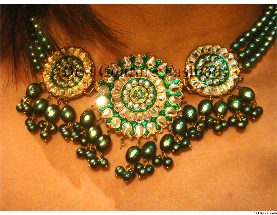 Green Goddess: Classic circular polki trio necklace in green semi precious beads (color can be changed according to your choice). 100% pure silver with gold plating. $145.