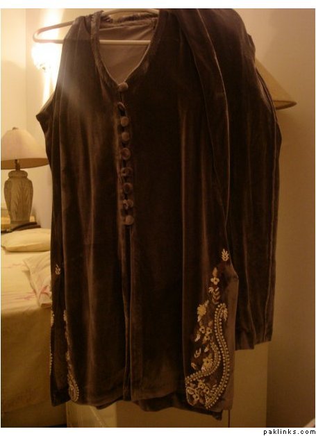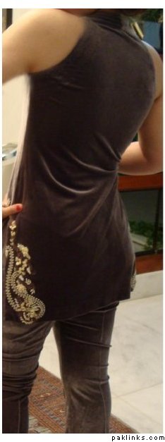 this is a very pretty charcoalish grey halterneck top with long fitted pants. Both are in velvet and the shirt has light embrodiery,
