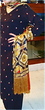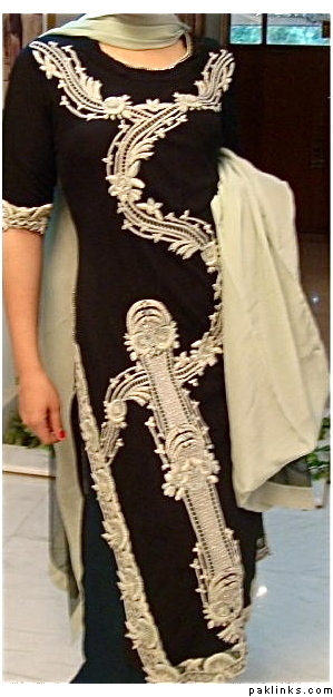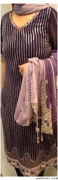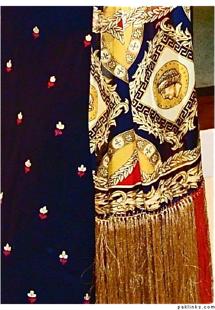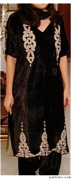 Very dark blue almost black with embroidered motifs (boties) all over the shirt. Silk printed dupatta with long thick resham thread long tassels.