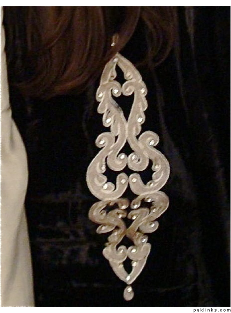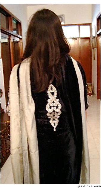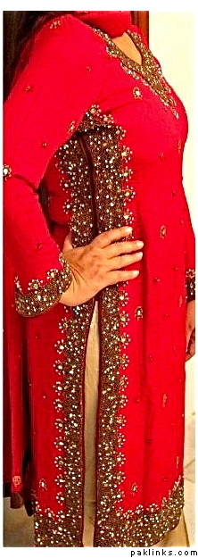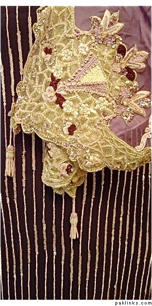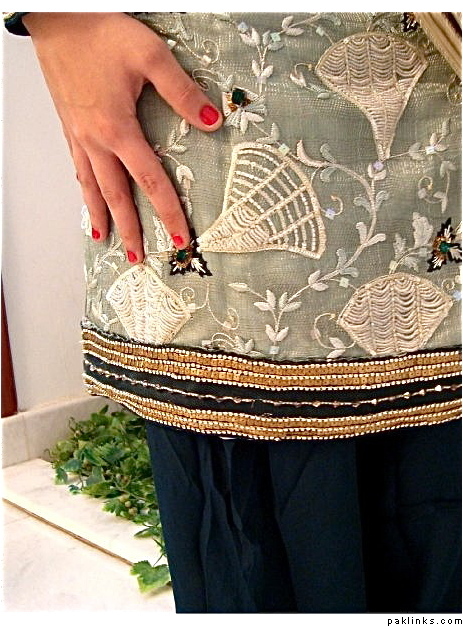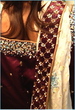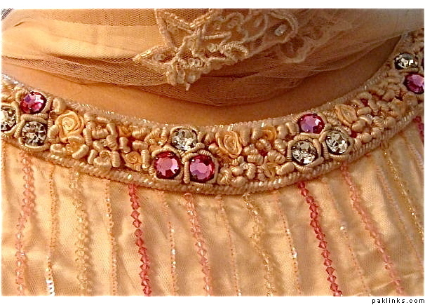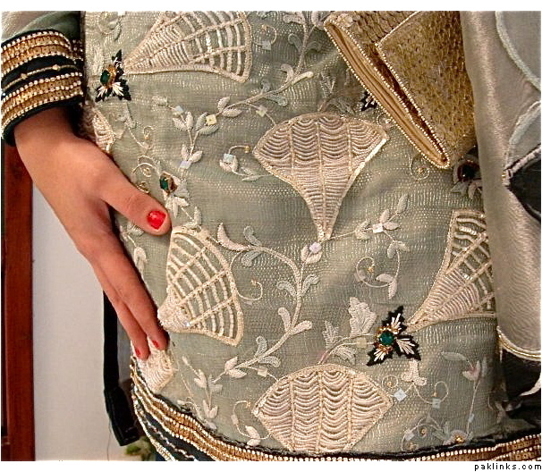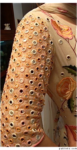 Full katdana, sequins, Svrf. crystals and stones, Thread knots, full vertical sequins. Big Stones. Net dupatta with cutwork, full katdana and booties (motifs). Gorgeous (love the dupatta). The hem includes a full boreder of heavy threadwork, real crystals and stones and cutdana.