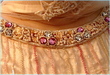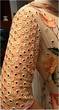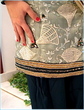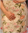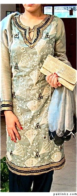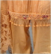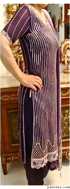 Pure chiffon with heavy beadwork on shirt border, sides, back and hem. Motifs all over. Color is really pretty brings out any complexion.