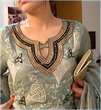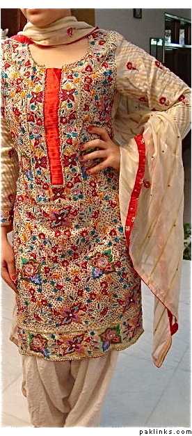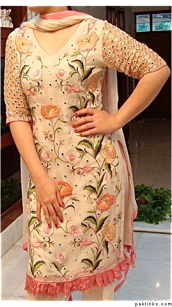 All the work done is by hand. Katcha resham with delicate mirror work, stunning colored embroidered flowers. Delicate mirror work on sleeves aswell. Chiffon Dupatta.