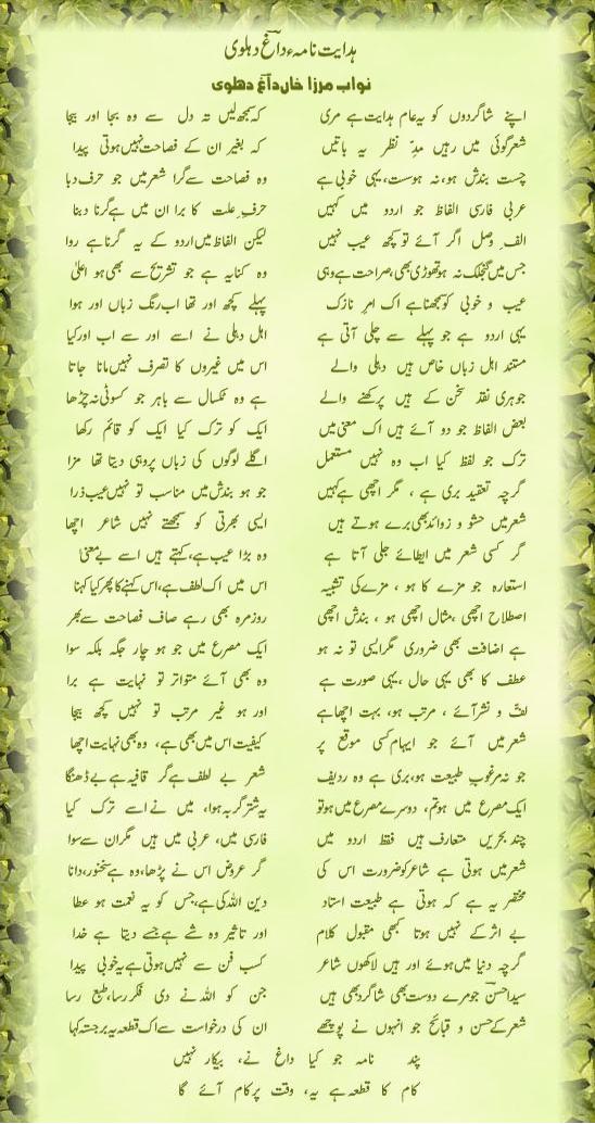 me’yaarii she’r_goii koii kaar-e-aasaaN nahiiN. iske liye ek ustaad kii zaroorat huaa kartii hai jo aaj ke daur meN har ek ubharte huye shaa’ir ko moyassar nahiiN…'aam taur par she’r_goii meN kuchh naqaa’is, KhaamiyaaN aur kamiyyaaN dar_pesh huaa kartii haiN jinkii taraf is nazam [ba_soorat-e-hidaayat-naamah] meN Ustaad DaaGh Dehlavii ne ishaarah kiyaa hai…agar nau-mashq sho’araa in nikaat par dhayaan deN to unkii shaa’irii yaqeenan in naqaa’is se mubarra ho saktii haiN…
