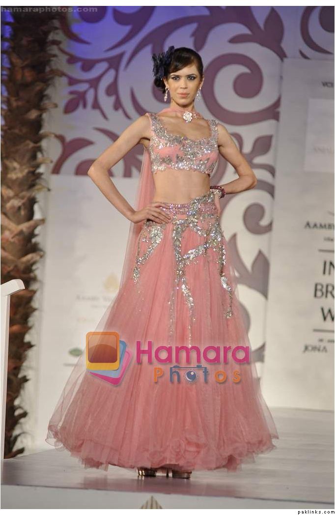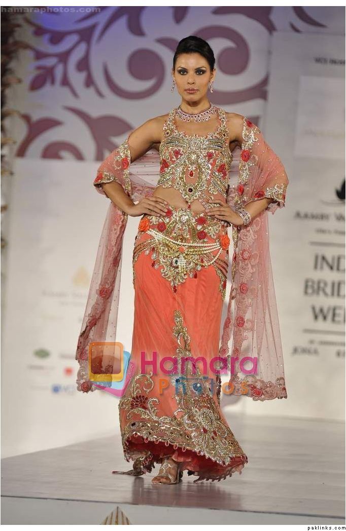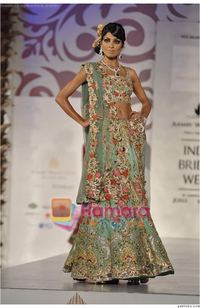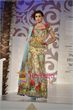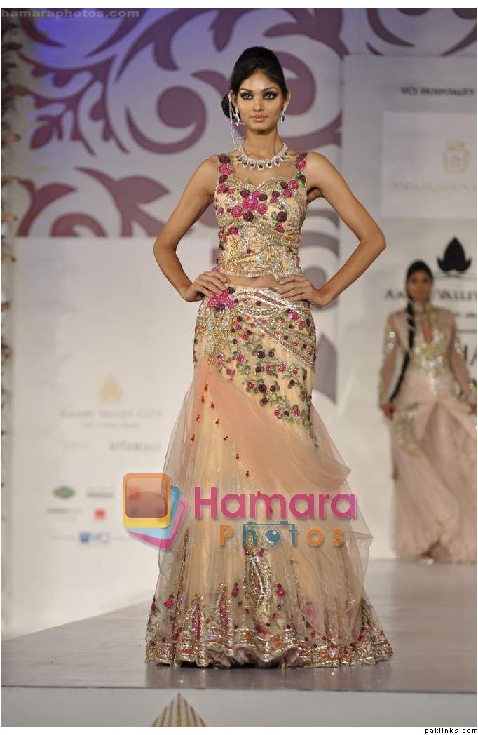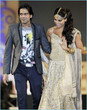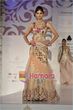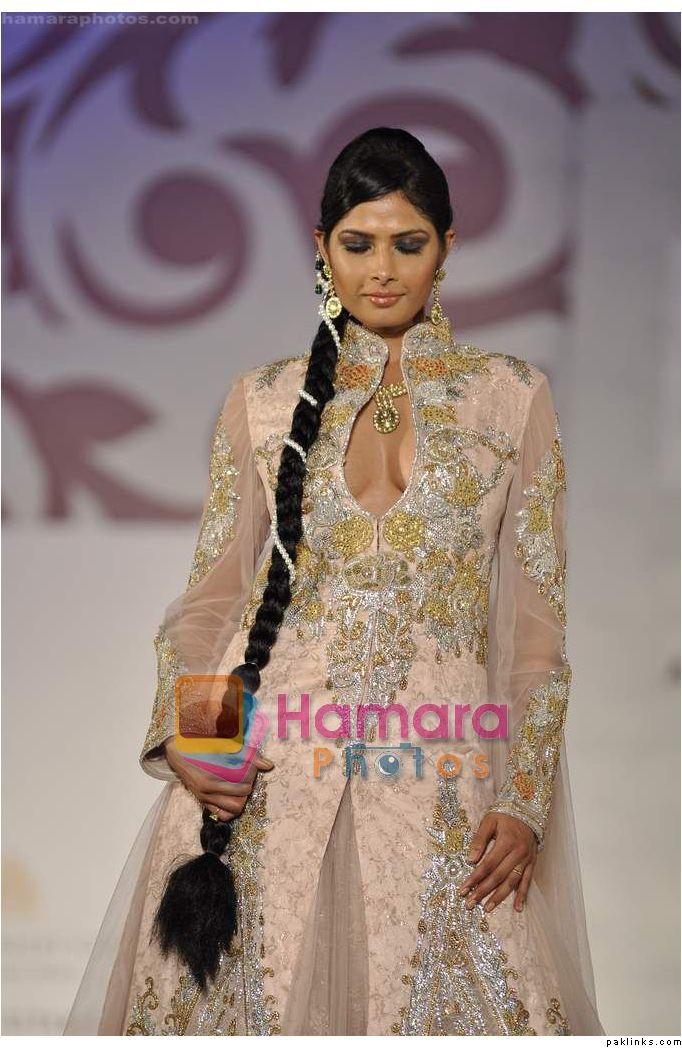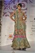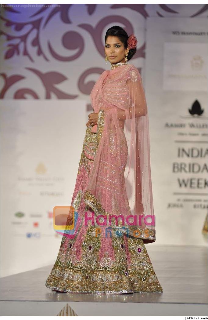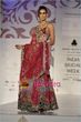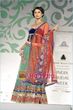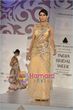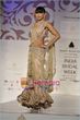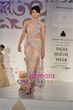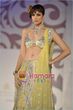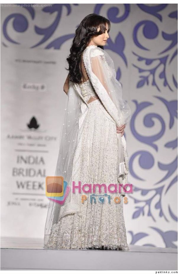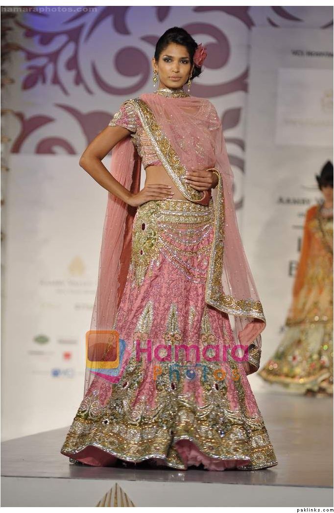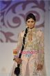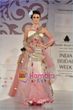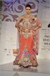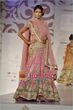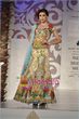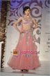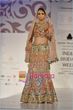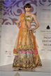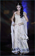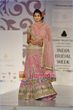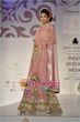 Kangana walked the ramp in a salmon pink colored trail lehenga with silver crystallized ornamentation. The fish scaled – inspired lehnga had the designer’s signature jeweled look. The lehnga was paired with a ruffled top and jeweled gloves.