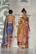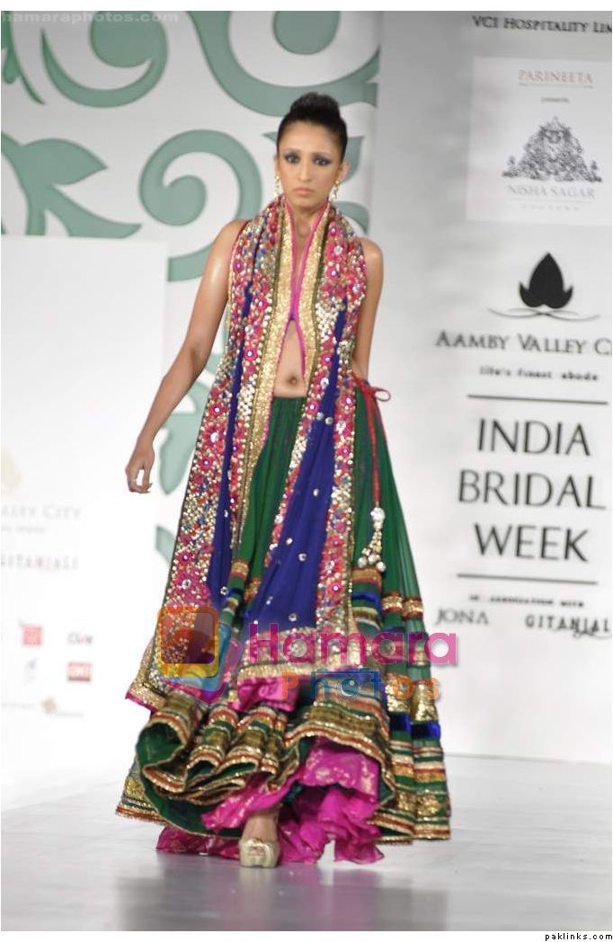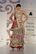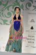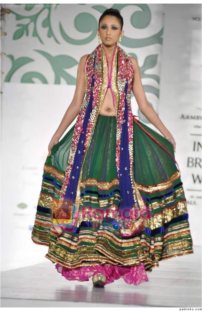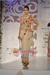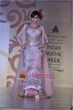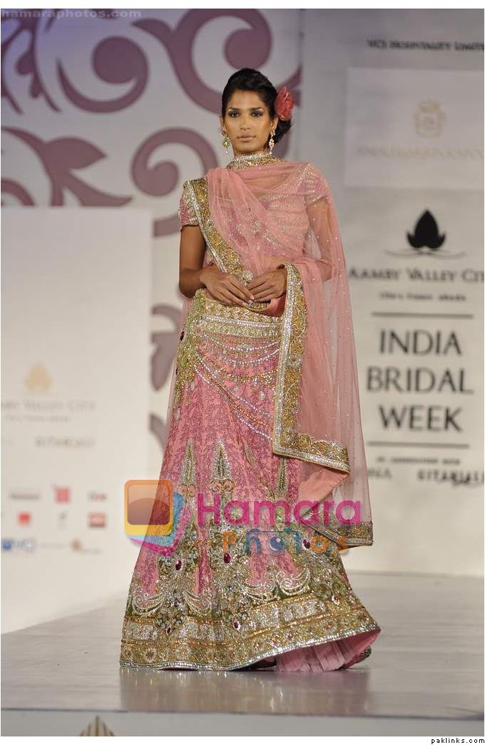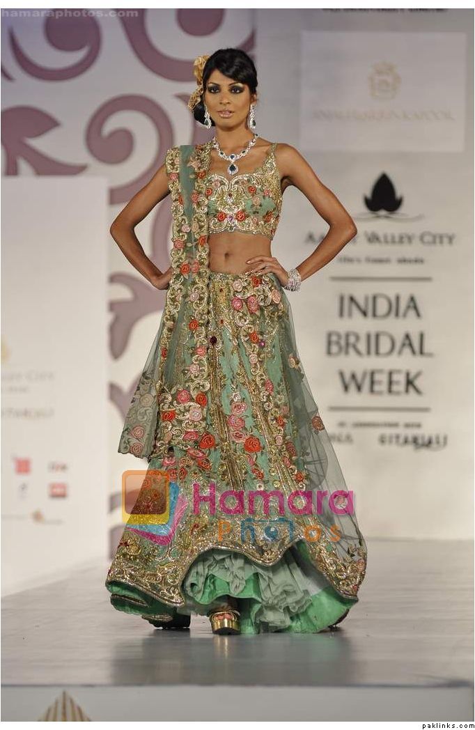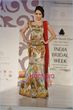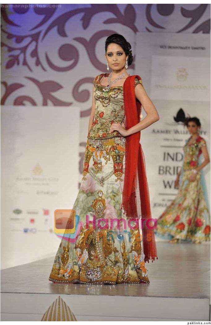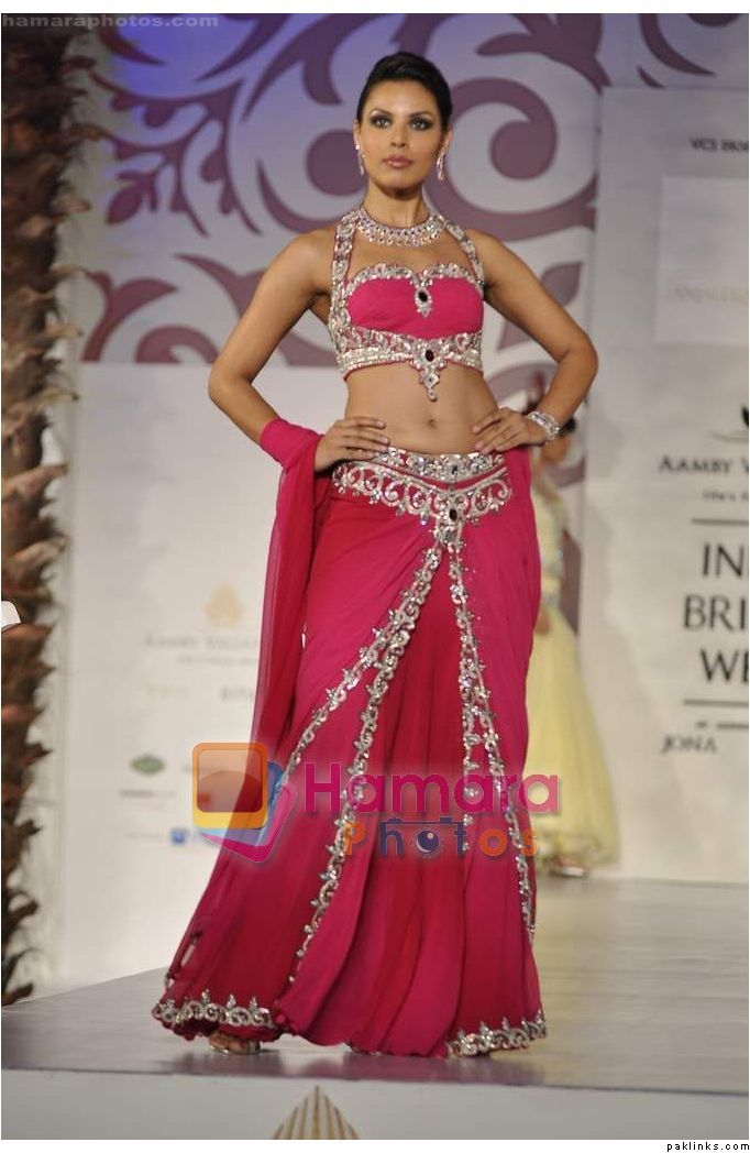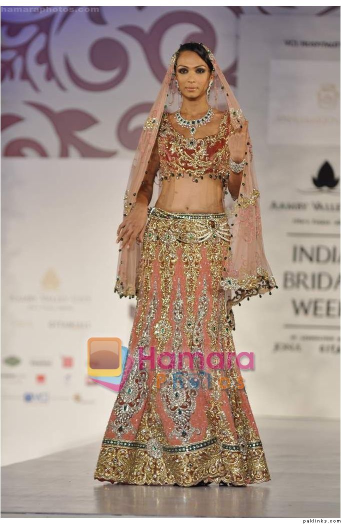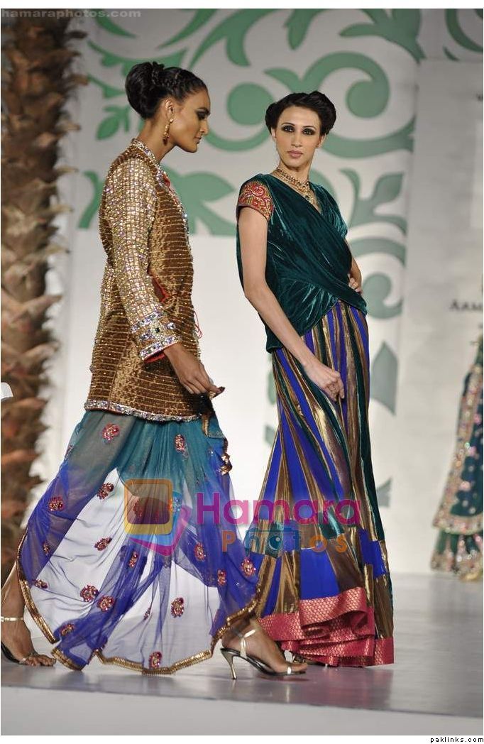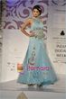 Kangana walked the ramp in a salmon pink colored trail lehenga with silver crystallized ornamentation. The fish scaled – inspired lehnga had the designer’s signature jeweled look. The lehnga was paired with a ruffled top and jeweled gloves.
