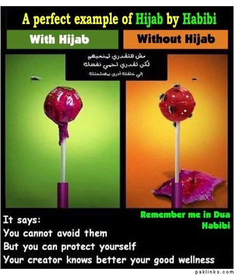 In lollipop wali tasweer main Merdon ko gand ki makhi se tashbeeh di gai hai??? Means agar orat hijab main nahi hu gi tu mehfoz nahi I wonder ye kaisa Islam or Islami mumalik hain ju kehty hain ke Orat or Allo ki bori main farq na nazer aey tu woh mehfoz hai warna nahi:D