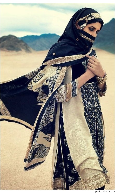 This could be a hijabi look with the dupatta set further down and a longer length of shirt.