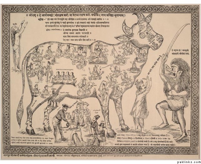 Here the COW and see what the link says at the bottom. The image here illustrates the Hindu belief that each part of the cow embodies a particular deity. For example, Brahma (the creator of the Universe in Hinduism) is her back, while Lord Vishnu](Vishnu - Wikipedia) is her throat. To the right, a man is seen as protecting the cow from being slaughthered.