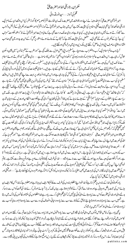 This article in jang newspaper caught my attention a few days ago. I have read that letter which the author is refferering to. And it is in my view the best handbook on good governance for a believer. Hazrat Ali karam Allah wajhu wrote this letter to one of his newly appointed governer. He has focussed on the welfare of the common man, his psychology, instinct behaviuor, loyalty and obedience in such a detailed manner that it would easily be called as the charter for good governance .sabhanAllah