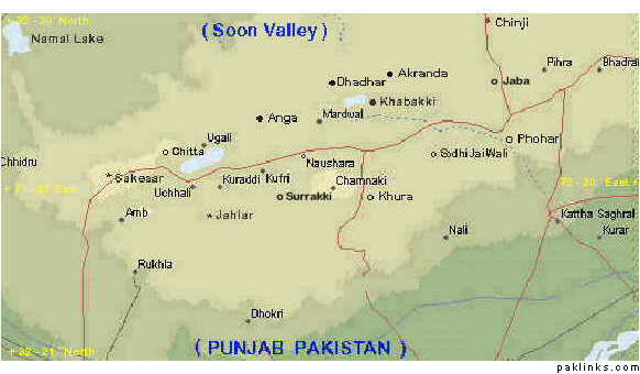 The Soon Valley is situated between the hills in the Salt Range. The area comes under the administrative control of Khushab District of Punjab Province, in Pakistan. Historically this might have been the extreme end of the region in which the Gandhara art flourished before the arrival of Awan tribes. The valley was a part of the state under the rule of Junjua Rajputs . They were forcibly ousted by the Awan tribes. The Awans, claim that their ancestor, Qutub Shah came along with the army of Sultan Mahmood of Ghazna in the 14th century . He headed Some troops of Alavids who had been given the title, "Awan" by the Sultan
