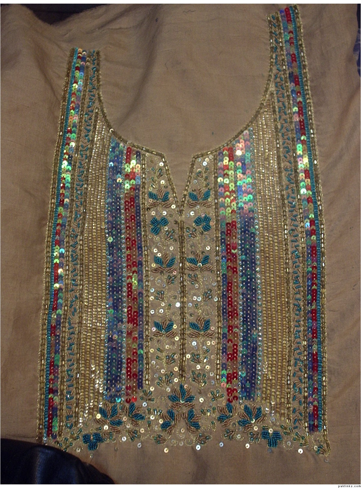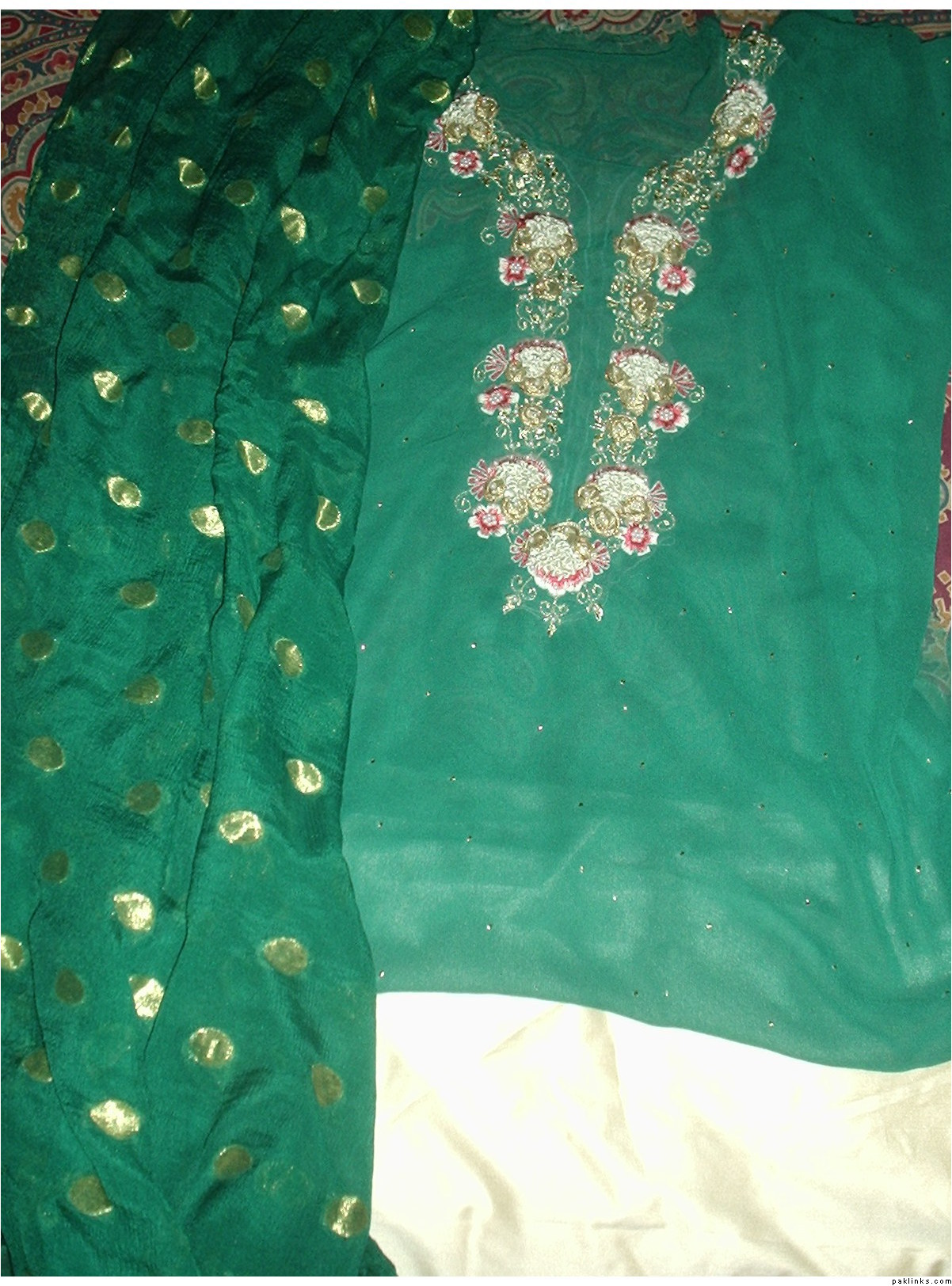 i got this dress made for myself from Gulf market karachi, that guy was quoting me Rs.6500 for this dress,which is waaaaaay less than 325$ and after reducing the size of the “chattha” from the daman i got it for just Rs.3000, as i didnt wanted such a heavy outfit, but still, he was charging Rs.6500 for the dress as it is shown in the pic, and let me tell you, the quality of the work is awesome, so i got the whole outfit for Rs.5000 that included stitching, AND cost of the cloth. the original color scheme of this dress is Teal and shocking pink and it looks beautiful in these colors. mine has a shocking pink banarsi patch between the gala and on the daman below the kaam. As im not in Pakistan and i dont have this dress with me at the moment otherwise i wud’ve posted pics of my dress too.