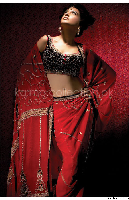 you could do a black chiffon lehenga, plain. and then do a long, fitted heavily embroidered black and dark pink shirt, with high side slits. you could add in silver accents or gold- either one would look really pretty.