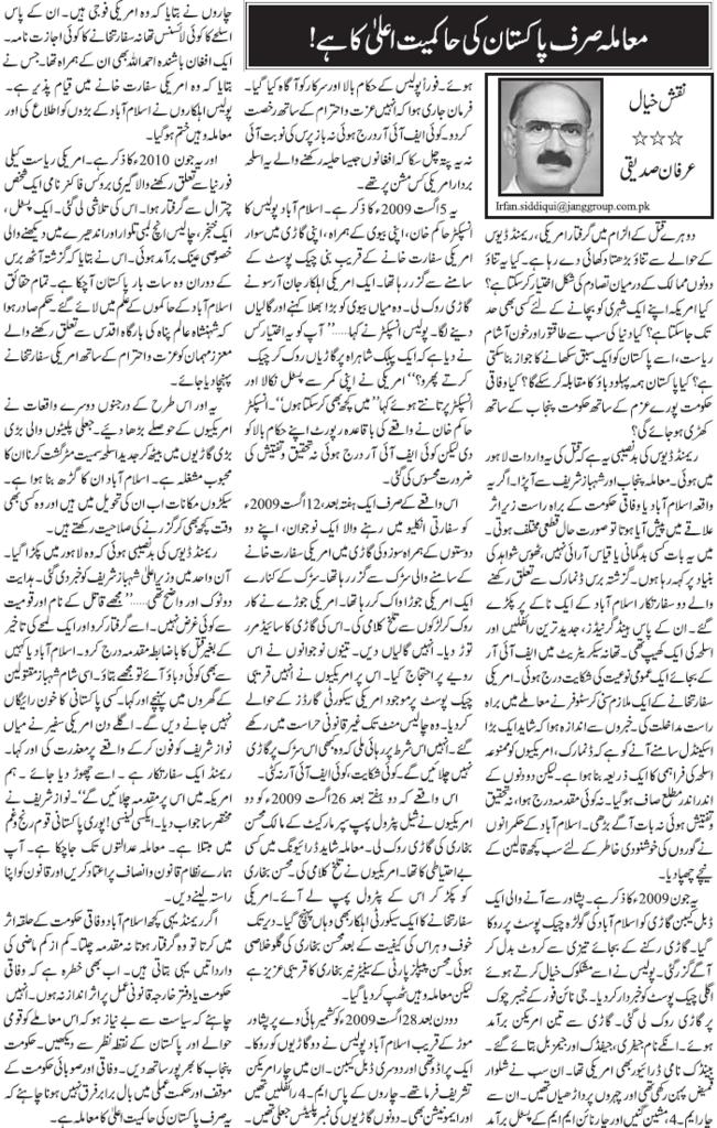 Let see, what federal govt. will do, as it is mainly on them to deal with it, Punjab govt. can only prosecute him ( along with making fair case against him and not leaving any stone unturned while doing so) in the courts.... as per few analysts, Presidential Pardon is only way out if the american is found guilty of killings.