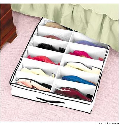 "Under the bed storage systems" - They are rectangular in shape, with dividers, can hold up to 16 pairs of shoes depending on the size, and has a transparent covering on top that can be zipped to prevent dirt accumulation. You have to find a good one cuz some can be very flimsy. Your bed needs to be >6 inches off the ground to fit this under.