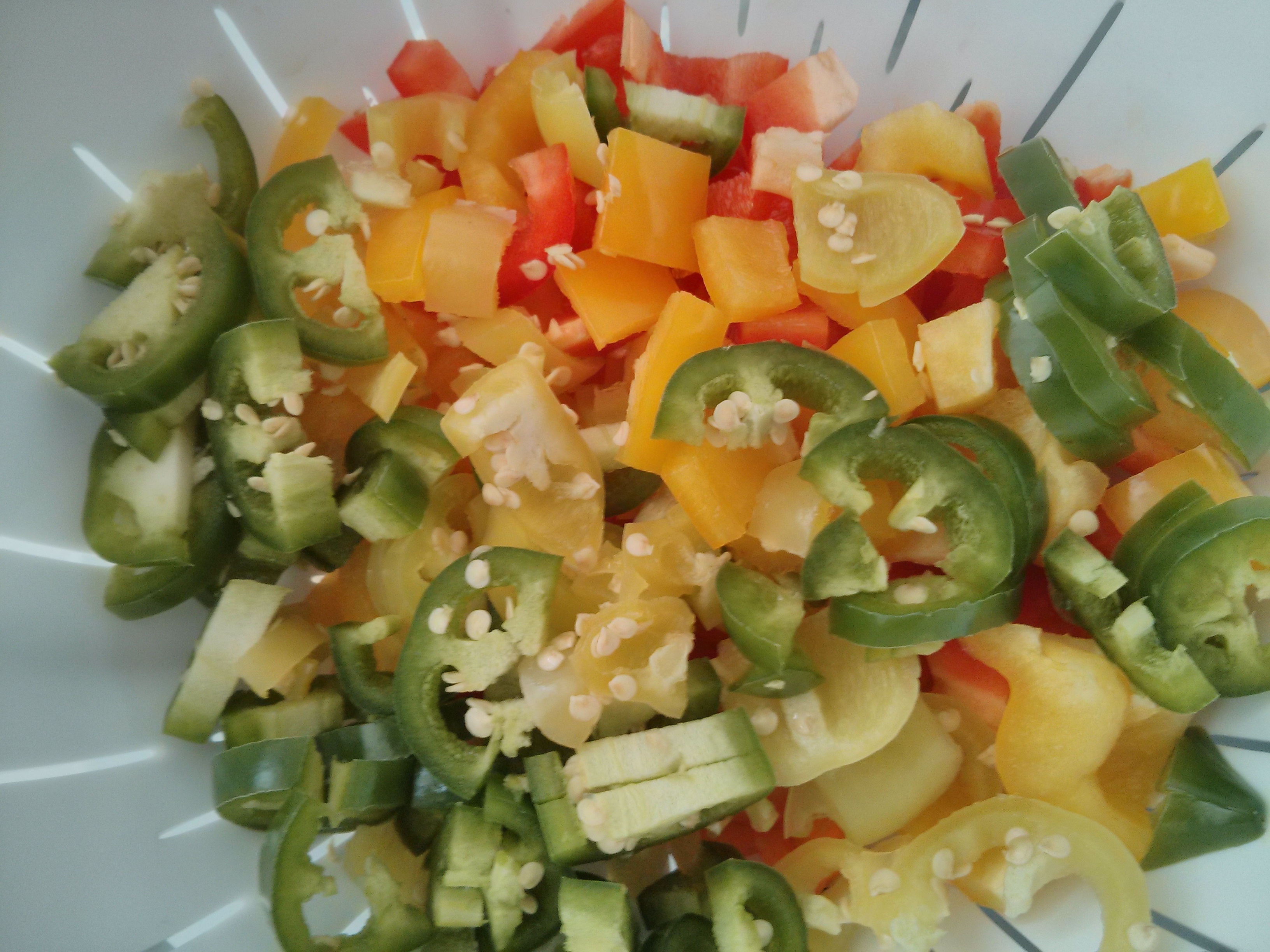 in all 7 kinds of peppers: red pepper, green pepper, orange paper, yellow pepper, cabana pepper, hot pepper, hot chilli pepper