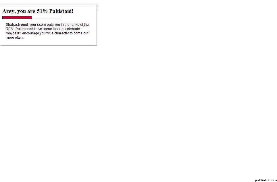 Shabash puut, your score puts you in the ranks of the REAL Pakistanis! Have some lassi to celebrate - maybe it'll encourage your true character to come out more often.