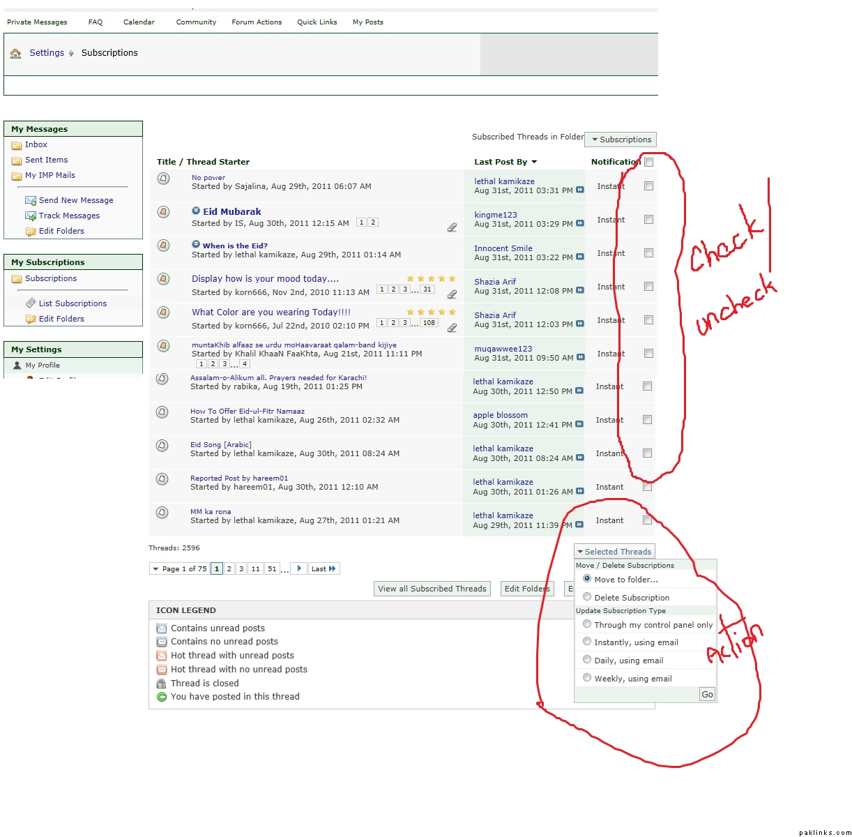 Select **Subscribed Threads **under the drop down list by clicking on **Quick Links **on top. You’ll see Title/Thread starter, **Last post by **and Notification.