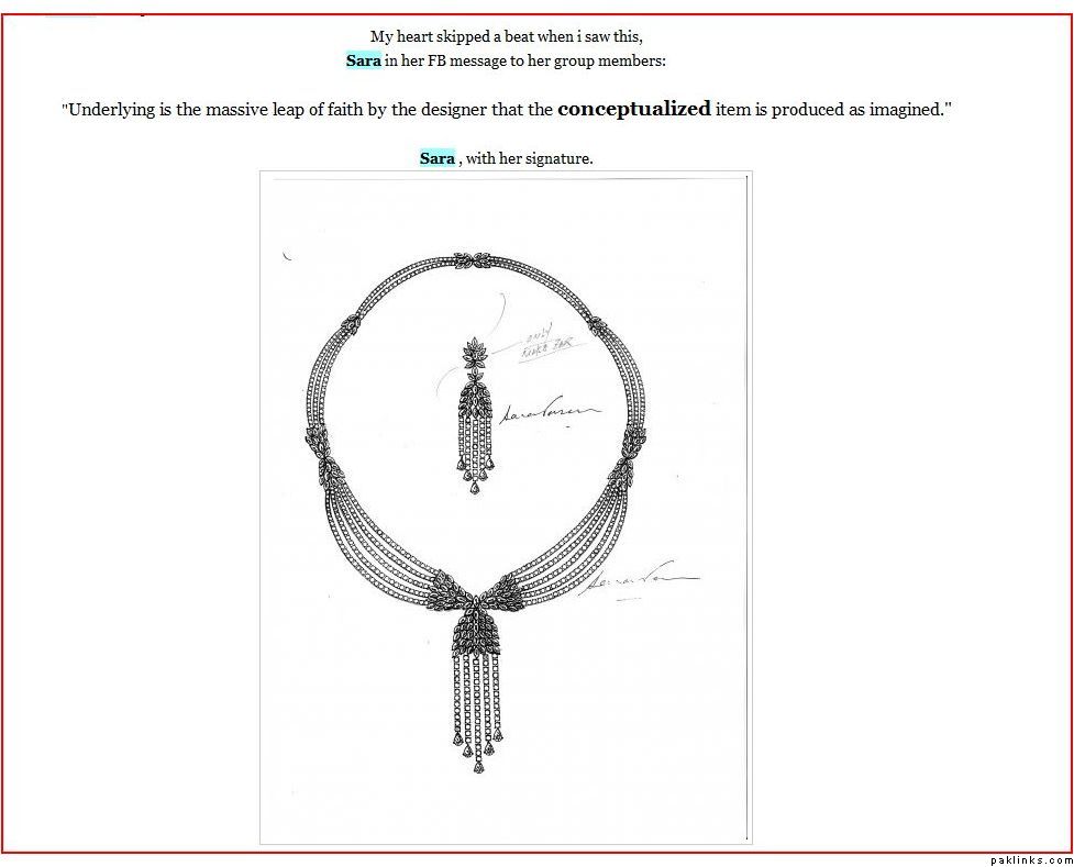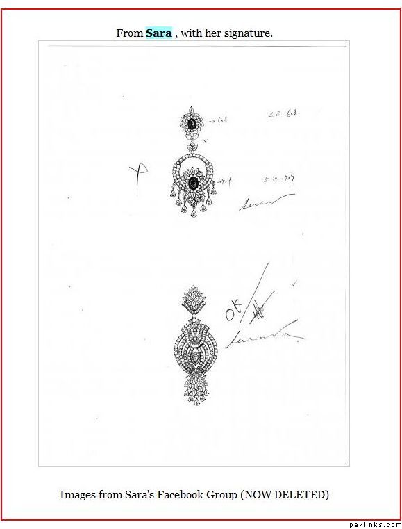 they know the price of every item in the store. I have also received several requests for them asking for images of my jewellery which I have ignored. I also got some very strange emails from them saying that they knew who I was etcetera etcetera.When I found out about the images uploaded to my Facebook group and the post on the website, I instantly made the connection that they were the ones who had done this. They have uploaded those sketches onto my Facebook group. this website’s sole purpose is to malign Pakistani designers and give them bad press. I have just done an entire expo of my jewellery in Singapore and I and other designers who take our work to all corners of the world are trying to promote a more moderate, open image of Pakistan - and this is to give us a bad name. We cannot be slaves to this anonymous, rogue website."*