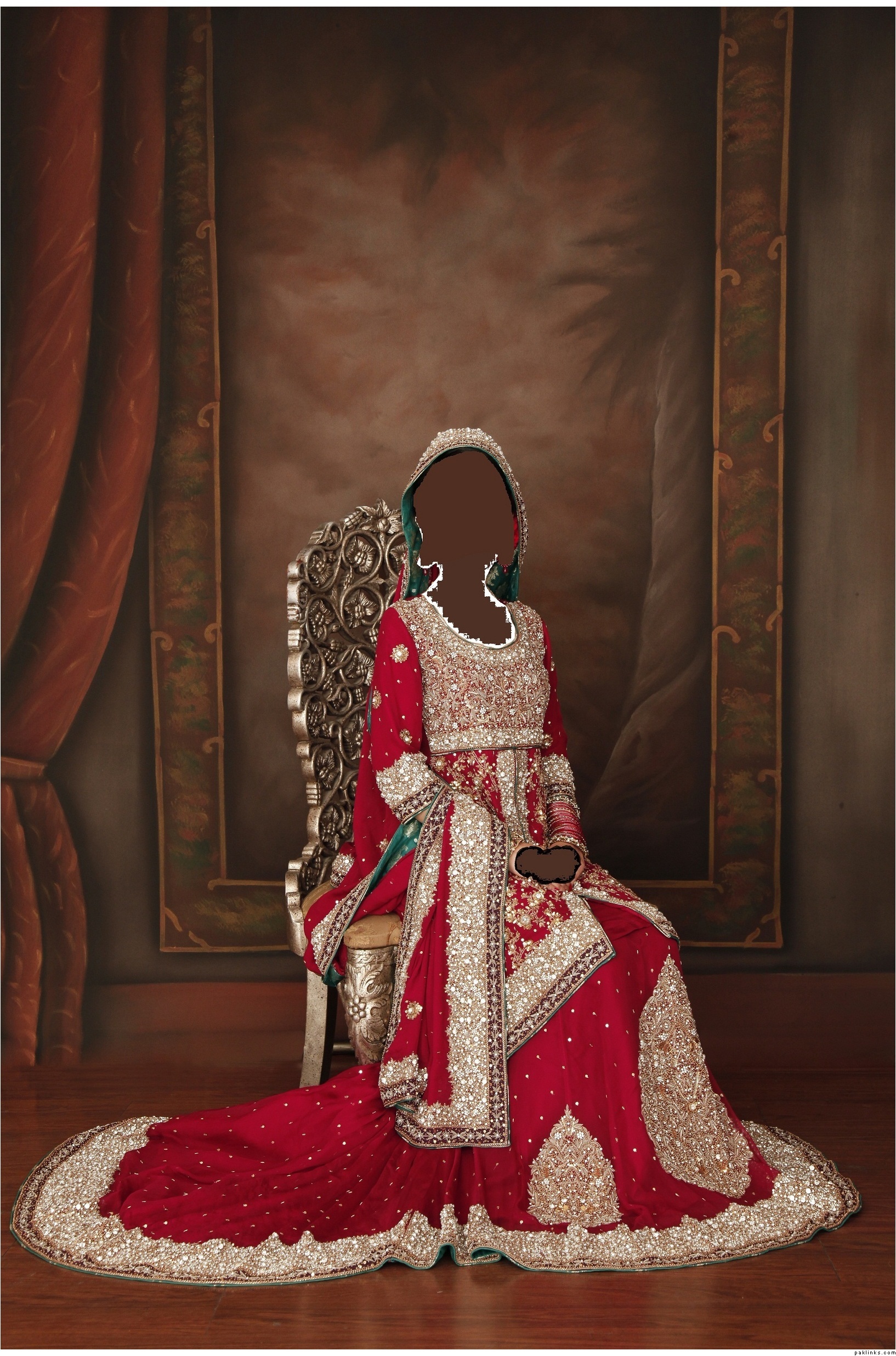 **A grand long and beautiful deep red pure chiffon lehenga with a back tail. Ornamental motif,sequins spray scattered all over the lehnga and handmade work at the bottom . Fully lined with rawsilk, Finished with sea green banarsi pipings. Hidden zipper and hook clouser.