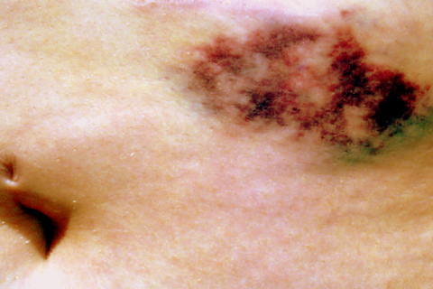 I was changing and looked in the mirror and noticed a HUGE purple/red/blue bruise on the bottom of my stomach close to my hips. I do bruise easily but I did not hit myself anywhere nor was it there last night. =/