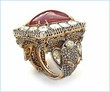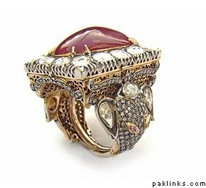 well u can let make such a ring from jodha akbar in pak. u can make it artificial and washed in goldwater or in gold. the last ring was kundan…and how i remeber the things ash was wearing was kundan… so just go to a jeweler and tell him the size he will make it for u…