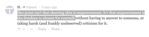 And she could have empowered herself by doing something useful? Going off the article the author is trying to get the Pakistani folk to concentrate on discoveries and science which I can associate with... but since when did showing skin help others? Making such a correlation is incohesive and doesn't make any sense.