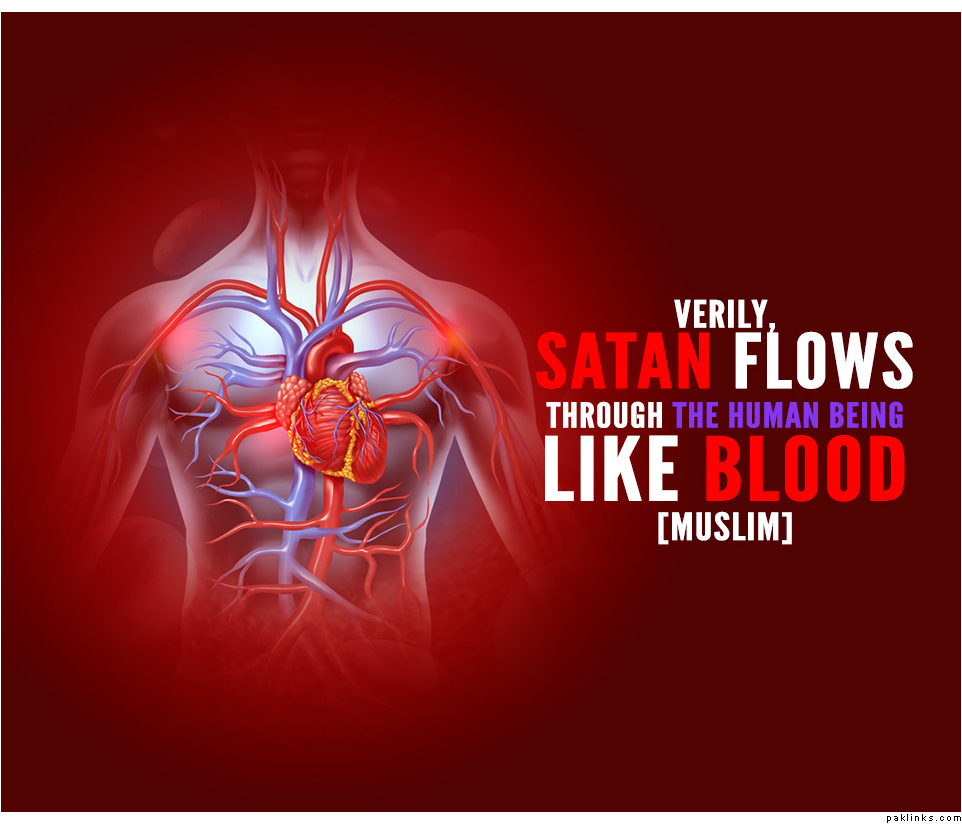 [3]](I am Satan - IOU Blog) Anas ibn Malik reported: The Messenger of Allah, peace and blessings be upon him, was in the company of one of his wives when a man passed by them. The Prophet called to him and when he came, the Prophet said, “She is my wife.” The man said, “O Messenger of Allah, I do not doubt you in the least.” The Prophet said, “Verily, Satan flows through the human being like blood.”