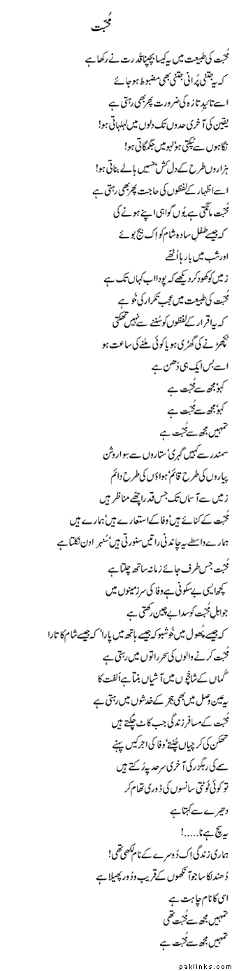 Reha, first of all, Mohabbat wo feeling hay… jo, I don’t think anyone can describe. Ye wahid aik aisee feeling hay jo sirf mehsoos ki ja sakti hay. Ye aik antenna ki tarha hoti hay jiske signals do logo ke darmiyan kaam kertay hain… they can’t express but they know that they Love each other. Love is not depend on the duration of months spent together… it depends upon the feeling you keep for someone… and prove through your actions