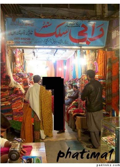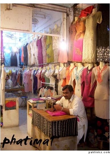 A bazaar in Lahore - shopping for kapra and picking out pretty designs for the darzii to make.