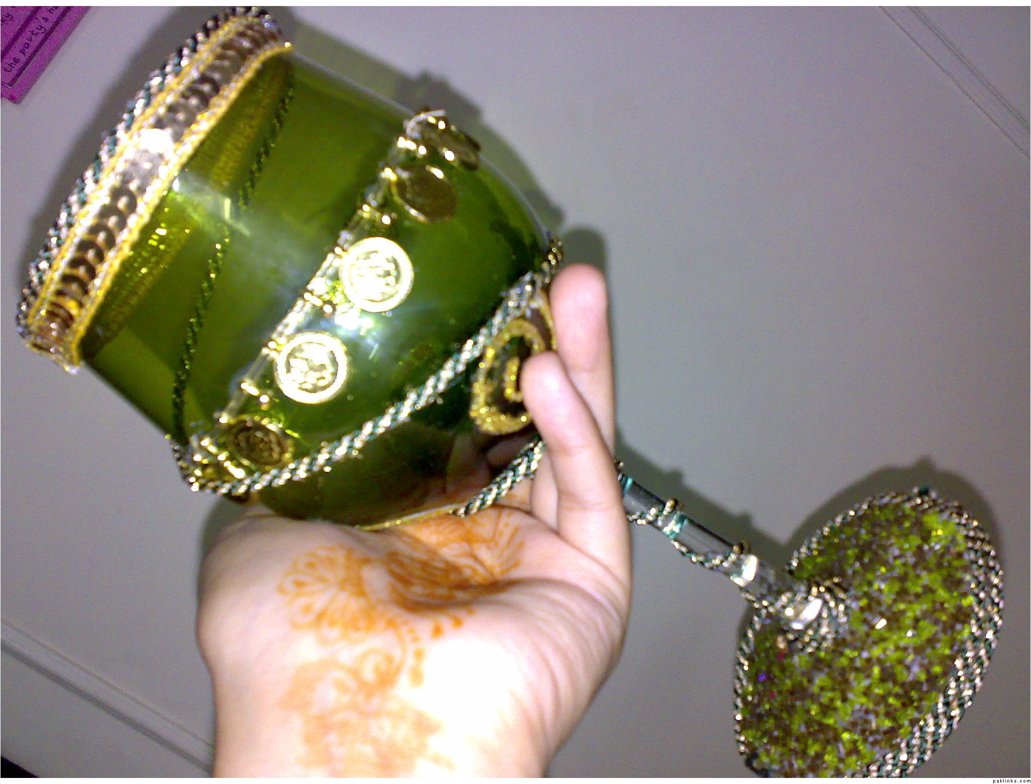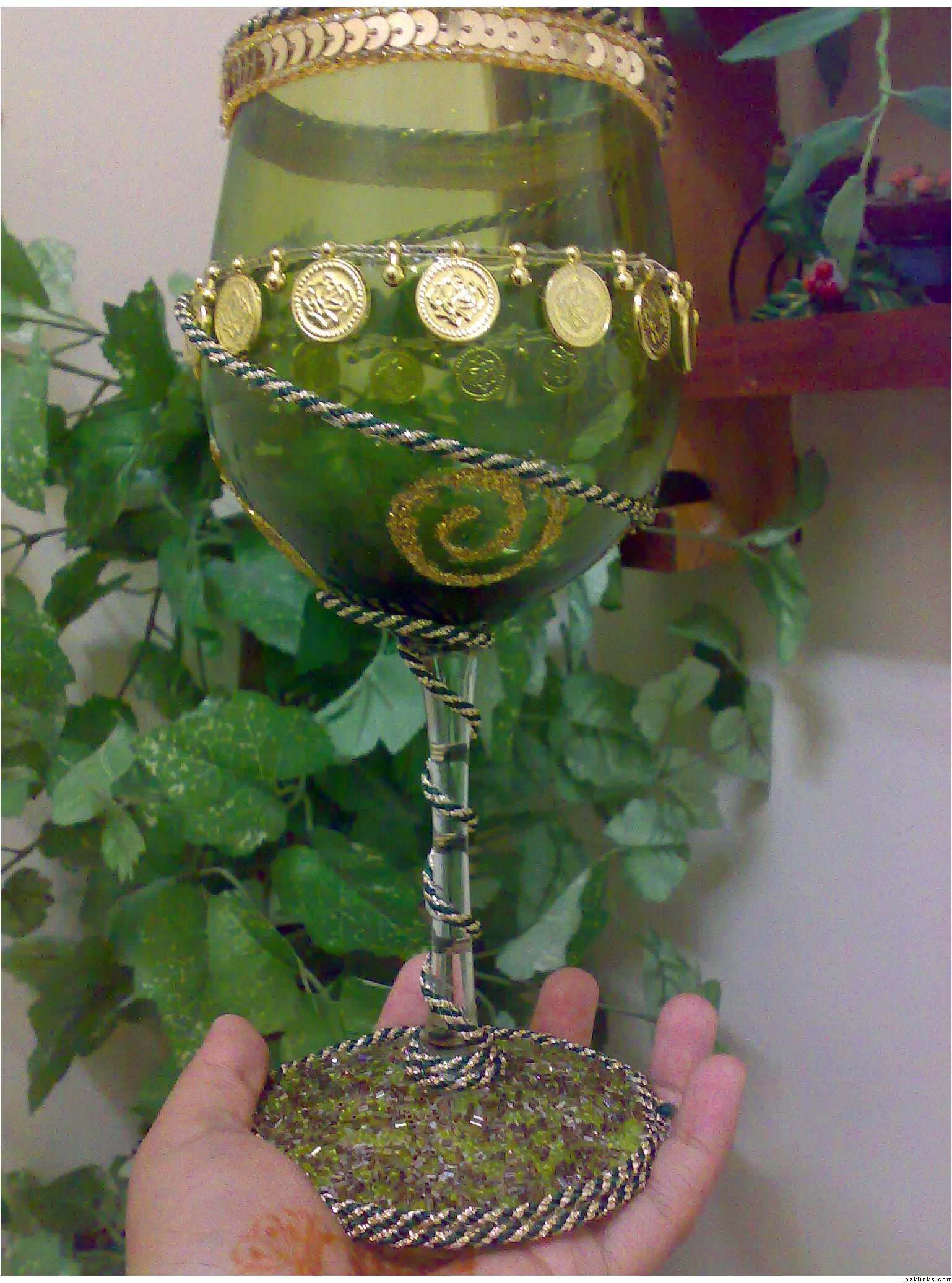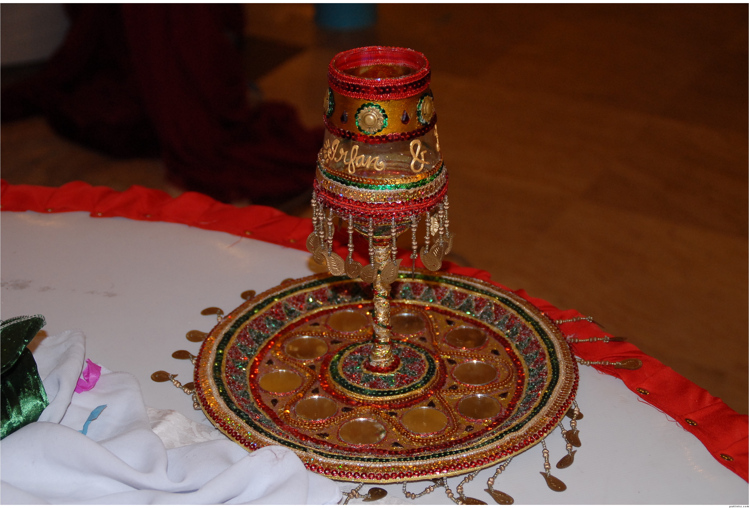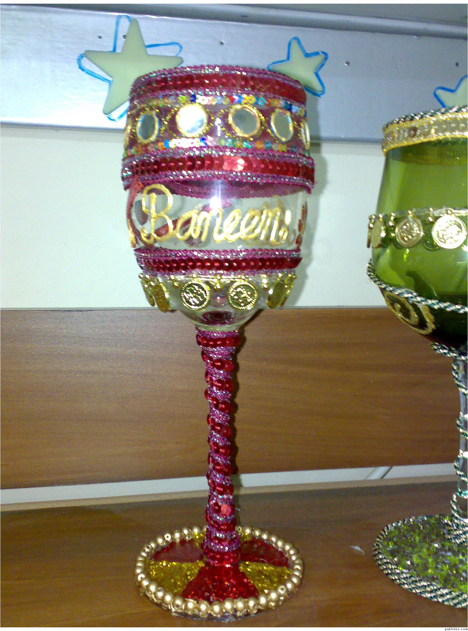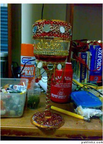 thanks for the compliments...well..i made those glasses using glue gun and for the base of the green glass, i used white glue....as for the sequins and all...most of them are laces sticked with the gluegun and glitter glues....and the writing of the names in the middle of the maroon glass ws by the glass paint outliner..they were meant to be the same colour as my cousin's wedding lehnga....
