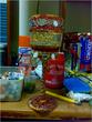 Any glass can be used for the rasam but prettily decorated ones are vogue now and people decorate them according to the bride's dress colours. I think UHU glue will do the trick but I let people who have actually made some answer that one.