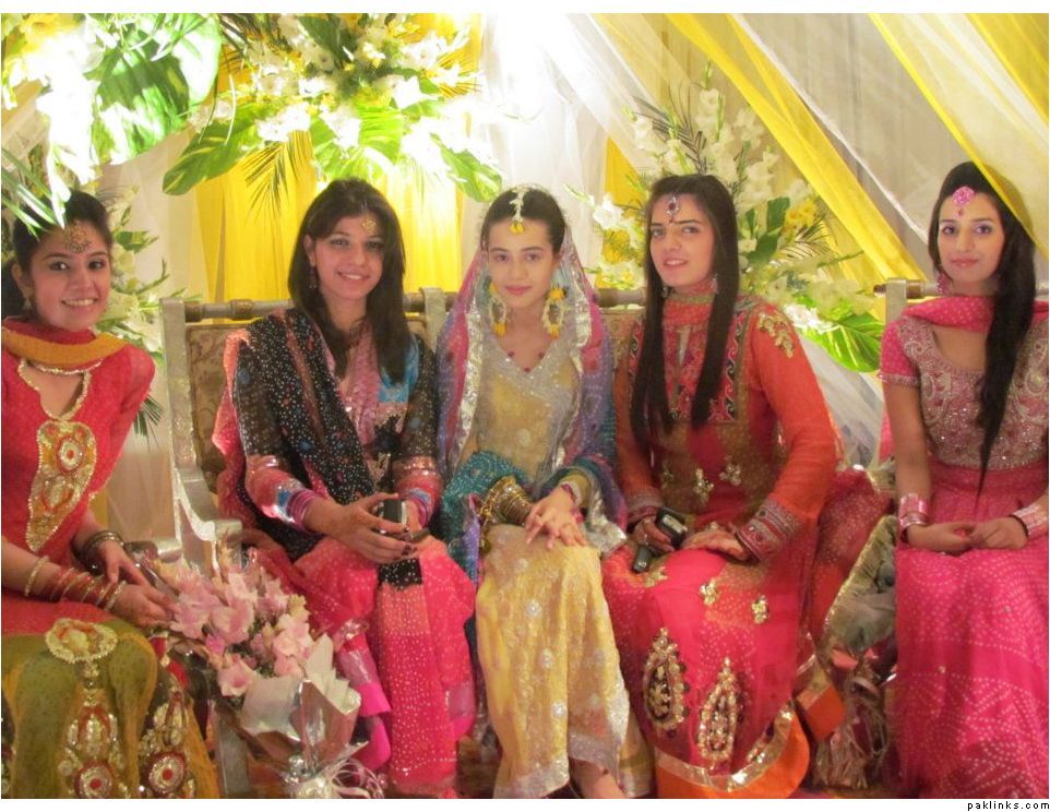 there are more pics! lol..check the album carefully. These are not designer at all. My sister in law who is sitting next to me designed her own dress, it is mostly ghota kaam, i can tell you about my dress its really simple lol, i bought two chunri suits and dyed it shades of pink. I bought two because i wanted a frock, and normally chunri comes in 3 piece suit. Then i looked around the backside of liberty in lahore, you know when you walk past khusa mahel, and thier are narrow alleys full of different kinds of work at a fraction of a price of something designer. I saw that body work in one shop and told him to do it on my dress, plus the bottom dress is sprayed with a "chahta" and there is a border on the sleeves , frock and the dupatta. I only wish the body length (the top chest part)was less because it was too long and looked unflattering.