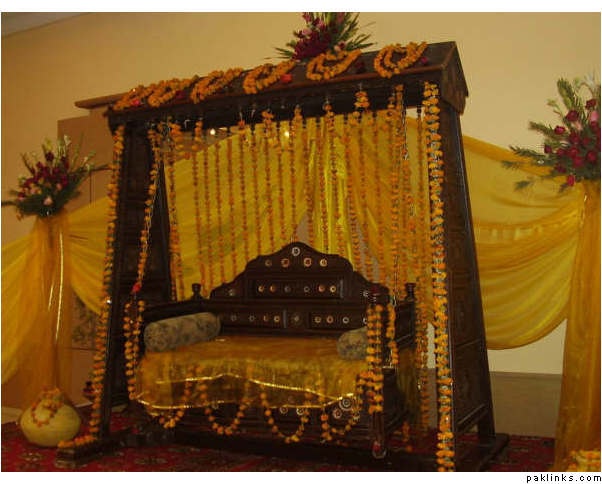 I think a good idea would be to take net ka kapra (like green and yellow) and like hang that down from the back or something. We're decorating the bench with this yellow and green kapraa. We've also got lights and stuff. My sister said no balloons - she doesn't want it to look like some kiddy birthday party lol. My mom got some of those "gaoun thakkye" (those round pillows) to put on the ground and we've got the mehndi trays and stuff...