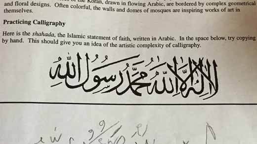 to be fair, this is a bit weird - the teacher could have picked something less sensitive to copy than the shahada. like "hello, world" in arabic. how would muslims react if their kids came home with homework that involved writing "jesus is the only way" or something.