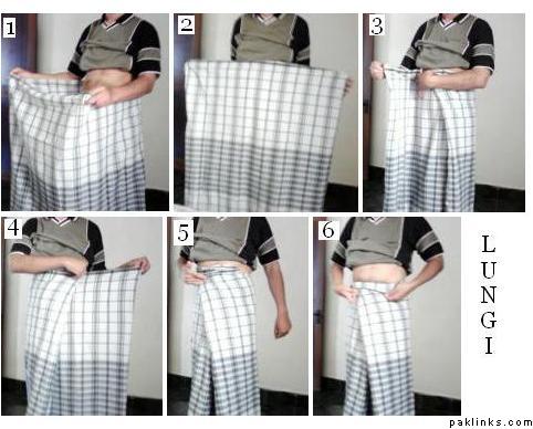 A lungi is what I guess I knew to be a tehmat (my Nana used to wear it in Pakistan). Here is a step-by-step guide on how to wear a lungi: