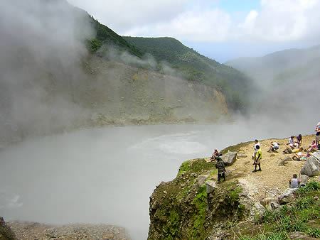 Dominica’s Boiling Lake is situated in the Morne Trois Pitons National Park. It is a flooded fumarole 6.5 miles east of Roseau, Dominica. It is filled with bubbling greyish-blue water that is usually enveloped in a cloud of vapour. The lake is approximately 200 ft (60 m) across.