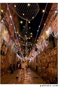 Decorated with lights for Ramadan, Muslims walk into the Al-Aqsa Mosque compound for prayers in Jerusalem’s Old City, Friday, Sept. 29, 2006. During Ramadan observant Muslims fast from dawn till dusk. (AP Photo/Muhammed Muheisen)