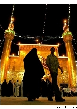 A couple walks outside a Shiite holy shrine of the Imam Ali Mosque in Najaf, Iraq, Tuesday Oct. 10, 2006, during the month of Ramadan. The ninth month on the Islamic calendar is considered the most venerated, blessed and holiest month among Muslims. (AP Photo/Alaa al-Marjani)