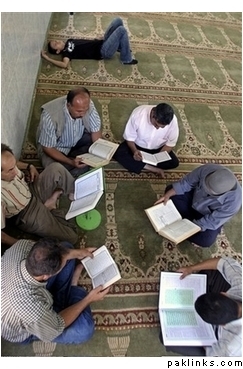 Palestinians read the Quran, Islam’s Holy book, and pray during the 18th day of the Holy month of Ramadan in the West Bank town of Jenin Tuesday Oct. 10, 2006. (AP Photo/Mohammed Ballas)