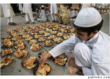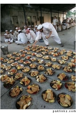 A religious student arranges food for breaking fast during the Muslim fasting month of Ramadan in Lahore September 27, 2006. REUTERS/Mohsin Raza (PAKISTAN)
