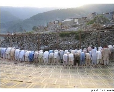 Survivors of last year’s earthquake offer prayers during the Muslim fasting month of Ramadan in Balakot, 180 km (112 miles) from Islamabad September 27, 2006. REUTERS/Ibrar Tanoli (PAKISTAN)