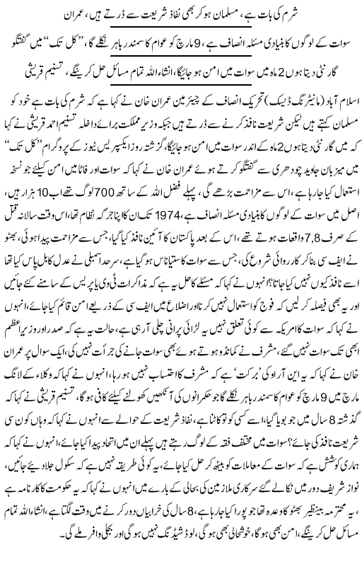 More demands from Imran Khan for Sharia in support of Taliban in swat.