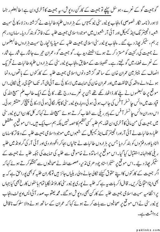 ** Reportedly many IJT workers and Nazims were upset with the thrashing of Imran Khan and his arrest and they also joined the protest.** There were reports that they would hold a Press conference at the Hailey College to announce their disassociation with IJT. The conference could not be held but some sources disclosed that it may be held on Friday(today).