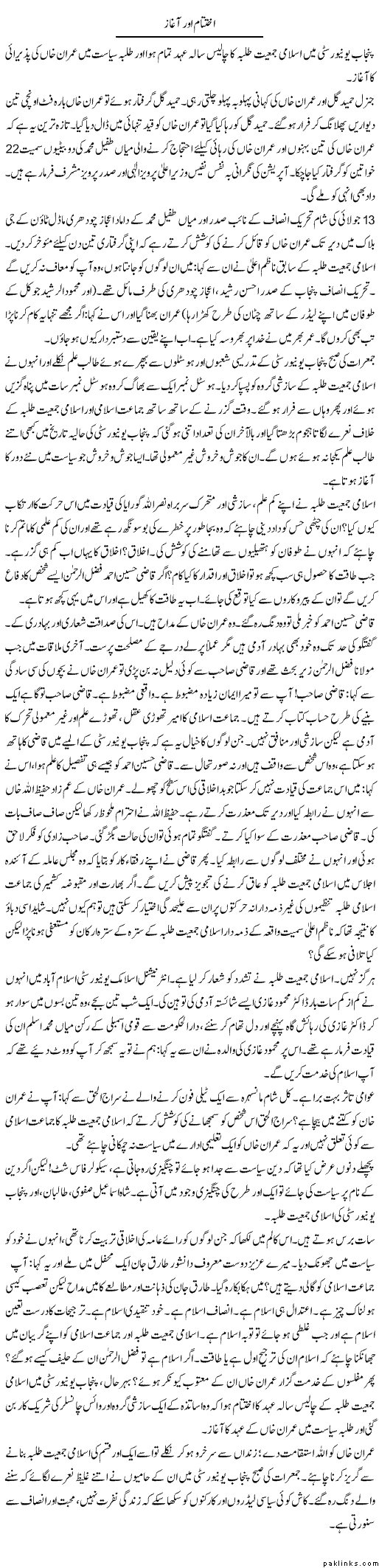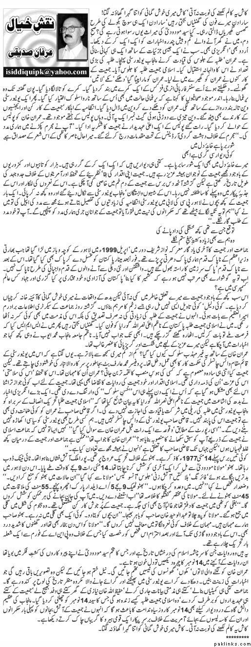 A day earlier, the statement of Jameit Nazim-e-Alla Nasrullah Guwariya was published in Newspaper and was very revealing. Statement: Islami Jameit-e-Tulba would not allow the leader of Tahreek-e-Insaaf to attend or lead the rally of Students at Punjab University. Even if Qazi Saheb has given security pledge to Imran Khan, than also IJI is not bounded to that. Qazi Saheb is not VC of Punjab University. On no circumstances, IJI would let or allow University to become political battle arena.