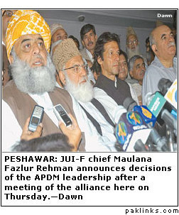 *Khan also commented thatBenazir Bhutto and Maulana Fazl-ur-Rehman are the only two opposition leaders who are allowed to freely roam and one is even given official protocol. “Both of them have played a major role in strengthening Musharraf by undermining the opposition at every stage. *